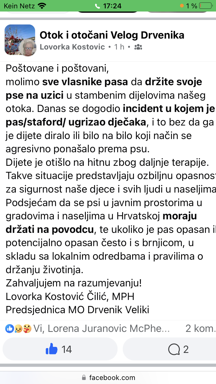 Nakon ozbiljnog incidenta na otoku Drvenik Veli, u kojem je pas bez povodca ugrizao dijete, ZIRONA.org se obraća javnosti, institucijama i svim građanima s jasnom porukom: ovo više nije pitanje osobnih stavova, već zakona, odgovornosti i sigurnosti života.